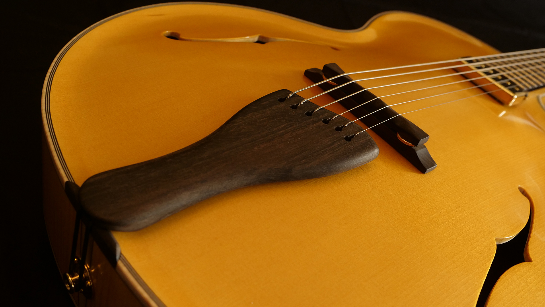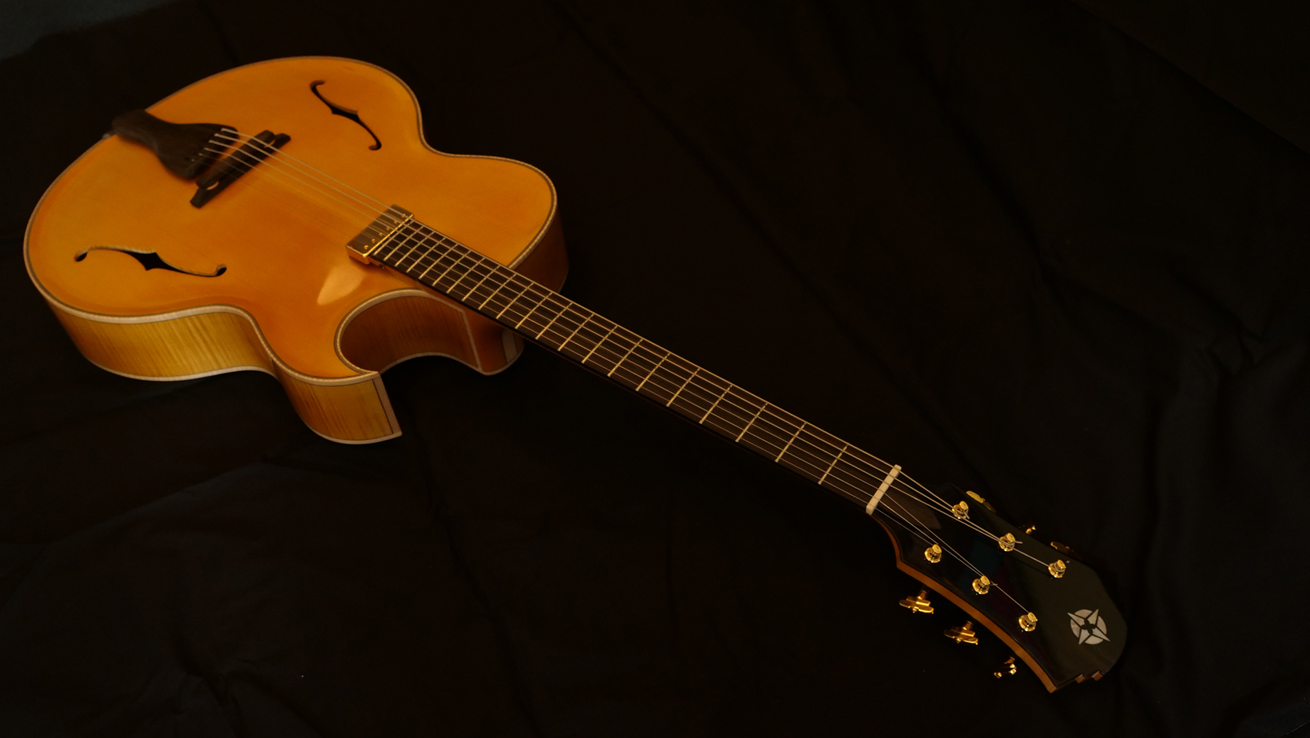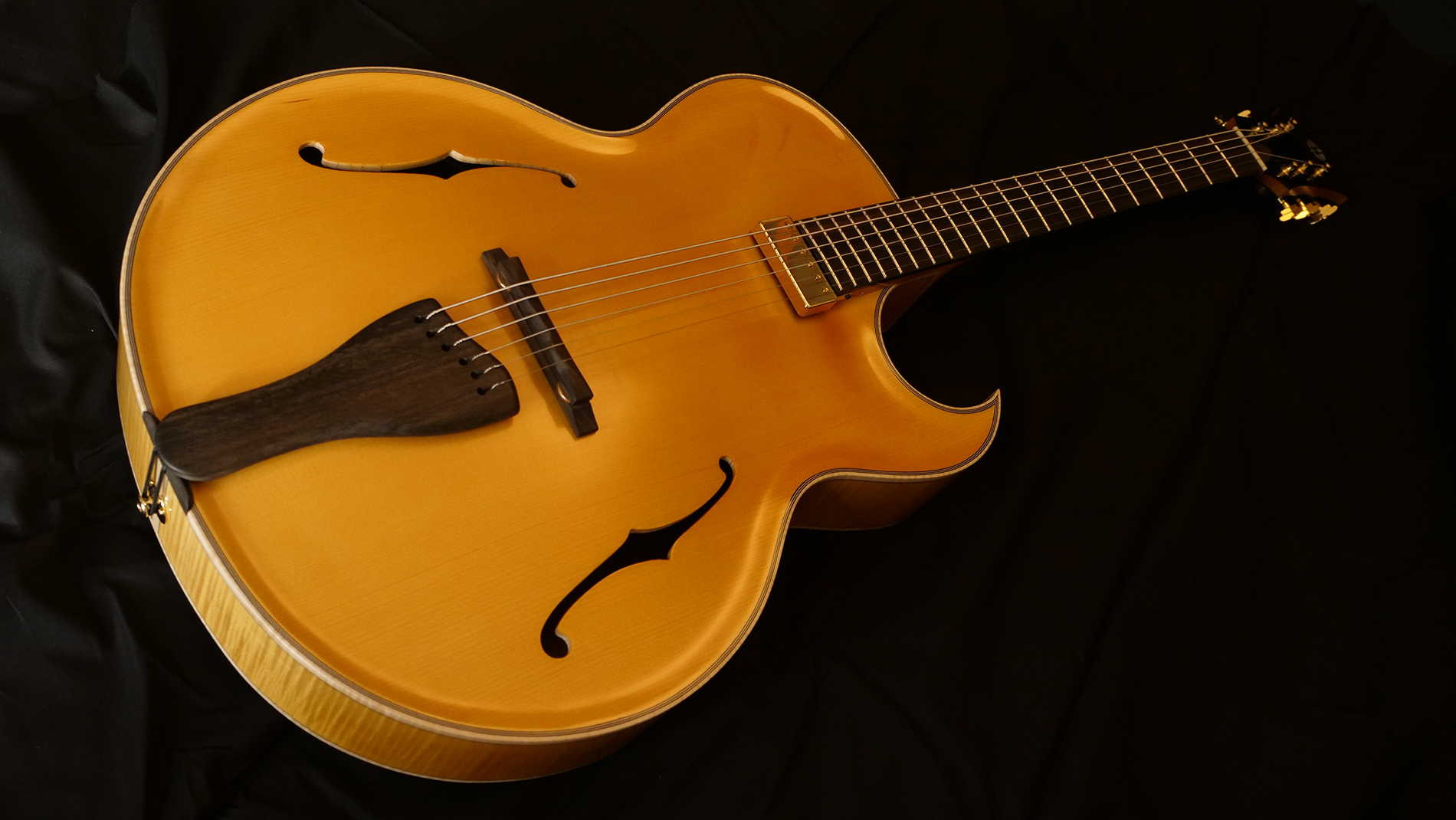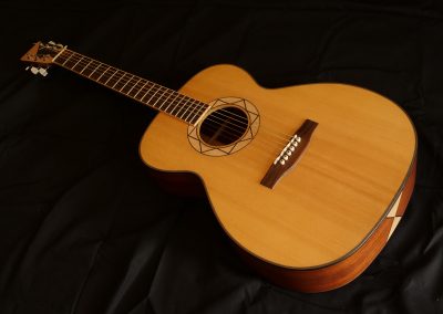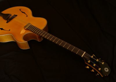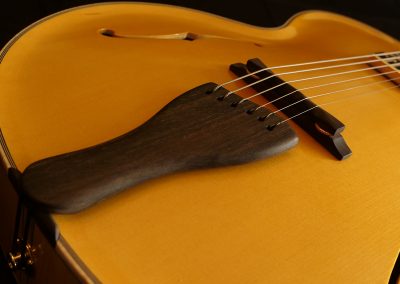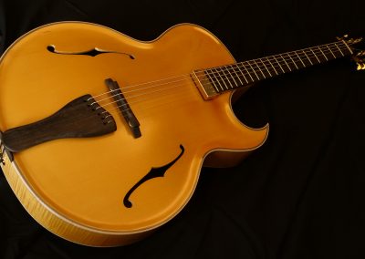 Guitare inspirée des fameuses archtop de Mr d’Aquisto et d’Angelico avec un pan coupé florentin favorisant l’accessibilité aux aigues. Elle se distingue par des sonorités amples et puissantes. Des barrages sculptés dans la masse lui apportent solidité et stabilité. Ses 17 pouces en font un parfait hybride de guitare et de basse. Un instrument inspirant…